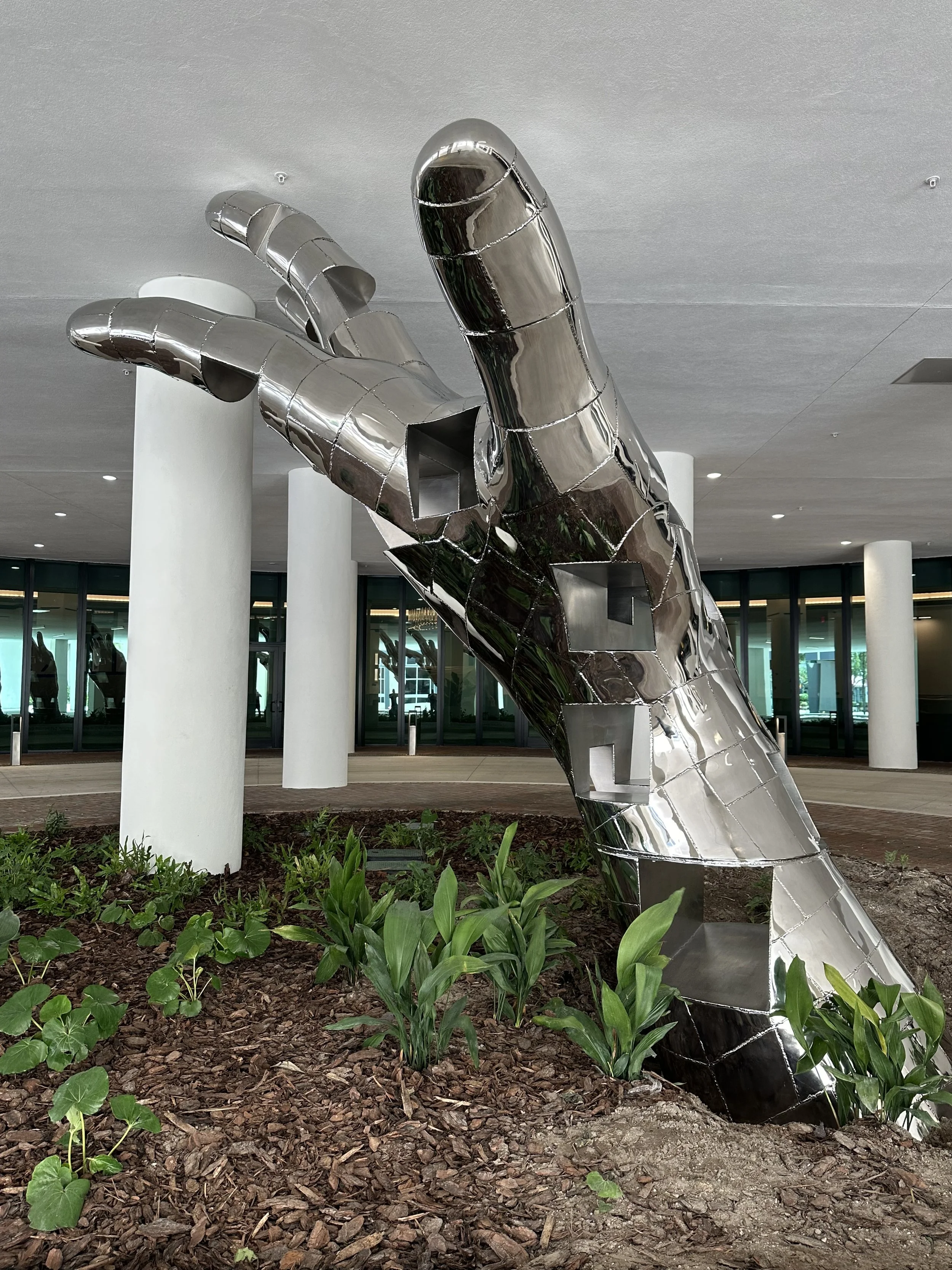 Touch is a 15-foot-tall stainless steel hand reaching upward in a gesture of aspiration and connection, its mirror-polished surface capturing light and reflecting the world around it to merge the viewer with its outstretched form. Installed at The Aster, the sculpture’s open spaces evoke lightness despite its scale, symbolizing the strength and grace of community, and embodying unity, reflection, and transformation as a reminder of the power in simply reaching out.